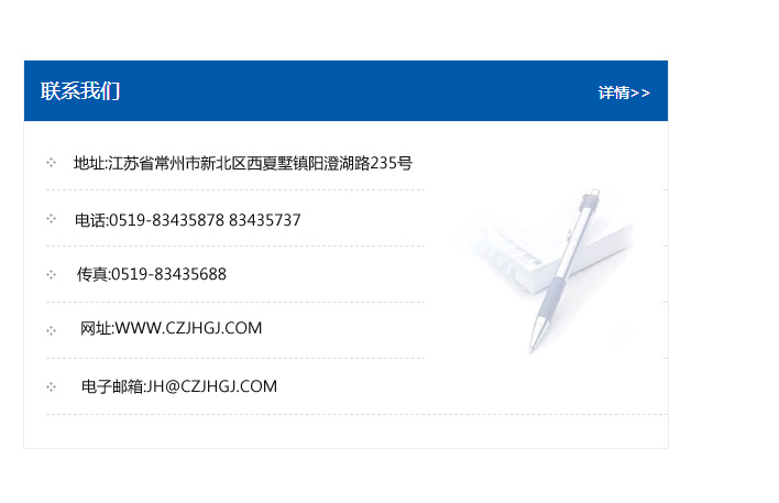 地址:常州市新北區友邦商務大廈1幢16、17層  電話:0519-85101652  傳真:0519-85112595  郵編:213022  網址:www.cz-jiayue_cn.hytjyy.com  郵箱:xiajifengaa@163.com